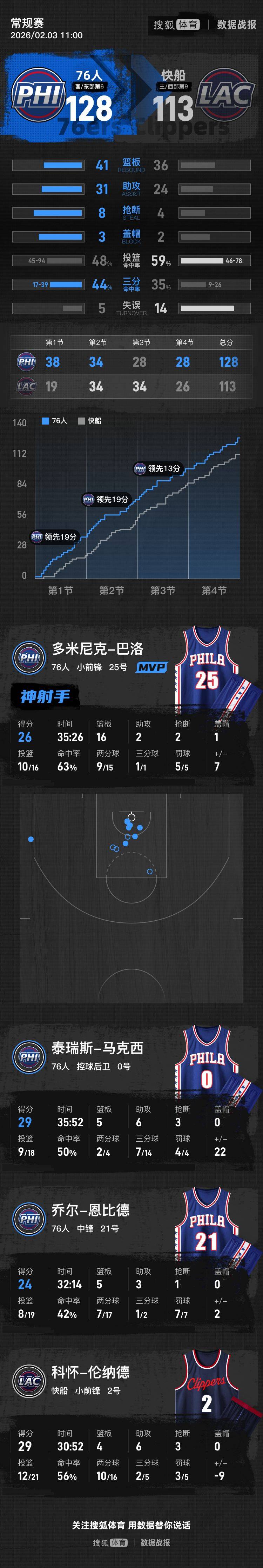 【搜狐体育战报】北京时间2月3日NBA常规赛,客场作战的76人以128-113击败快船,76人取得4连胜。巴洛26分16篮板2助攻,伦纳德29分4篮板6助攻。