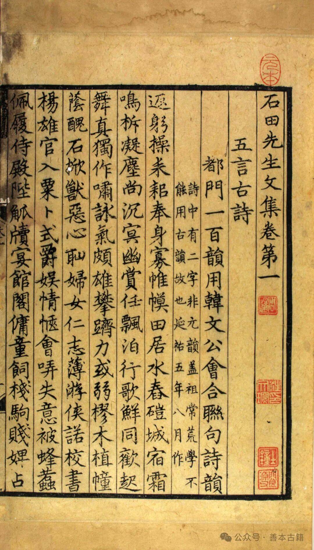 元代个人著述行世,通常须经学使审阅通过、备文咨部认可,然后分派各路儒学召工刻梓,故其卷首多列有牒文。《石田集》即是编就后,经宪司委名儒校雠无误,具牒发至扬州路儒学刊印。其卷首有至元五年王守诚、陈旅、苏天爵等序,正文之前则为后至元五年淮东道肃政廉访司下扬州路总管府交本路儒学刊板牒文。