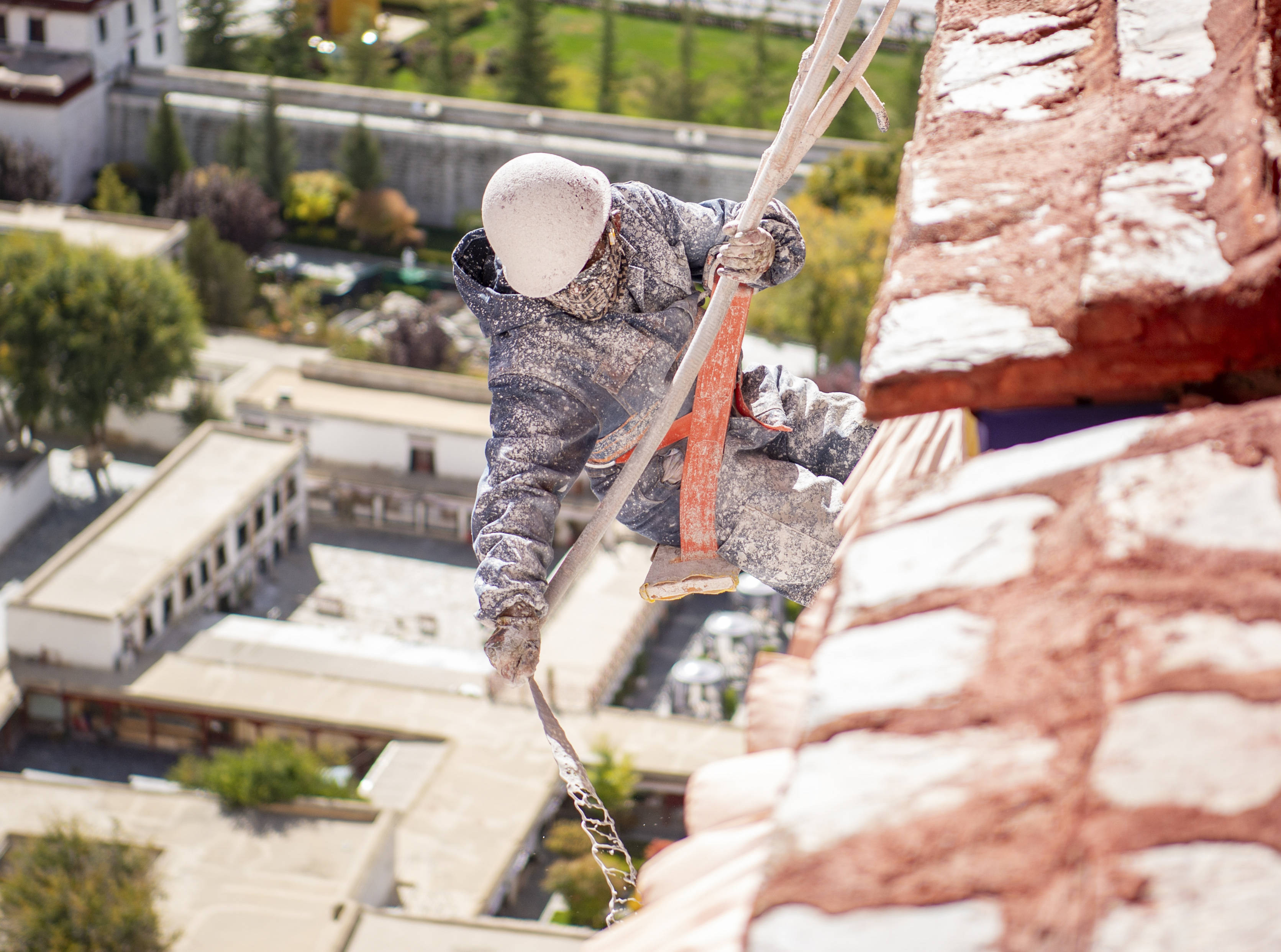 近日,西藏布达拉宫迎来一年一度的粉刷“美容”。工作人员和志愿者将粉刷材料按比例混合,经过滤后对布达拉宫墙体进行喷涂,让建筑更加美观。