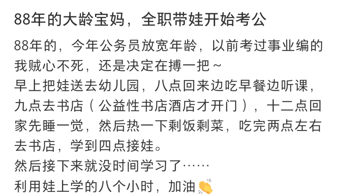 他们因为向往一个明确的规则、一个可预期的未来,以及一份能保障生活底线的稳定而选择报考。但同时也必须面对一个现实:自己是否还能腾出大块不被打扰的时间,像应届生一样心无旁骛地刷题备考。
