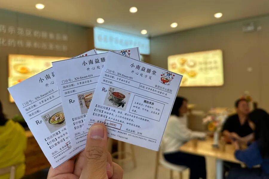 最特别的,要数一进门就设置的中医咨询台。在品尝甜品前,坐诊的中医科医生会为食客免费“望闻问切”,再根据每个人的体质辨识结果,开具“开心处方”。