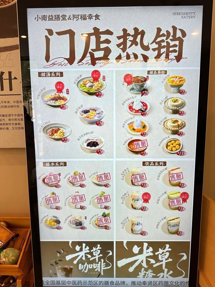 记者扫了一下桌上的点餐二维码,发现“小南益膳堂”已经一度登上了大众点评的“奉贤区小吃好评榜”第1名,就价格而言,甜汤和甜品价格在22—28元间,饮品多为18元。