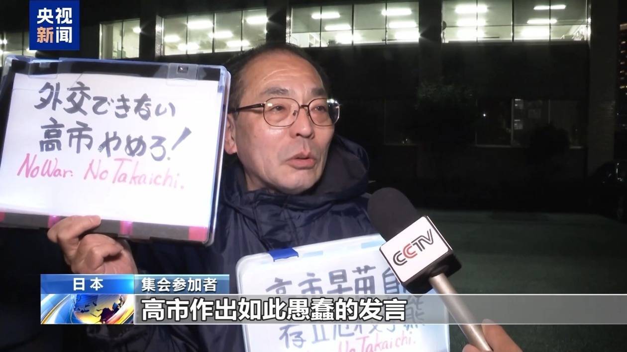 集会参加者高举标语,还有人高喊要求“高市首相立即撤回错误言论”“不准煽动战争”等口号。