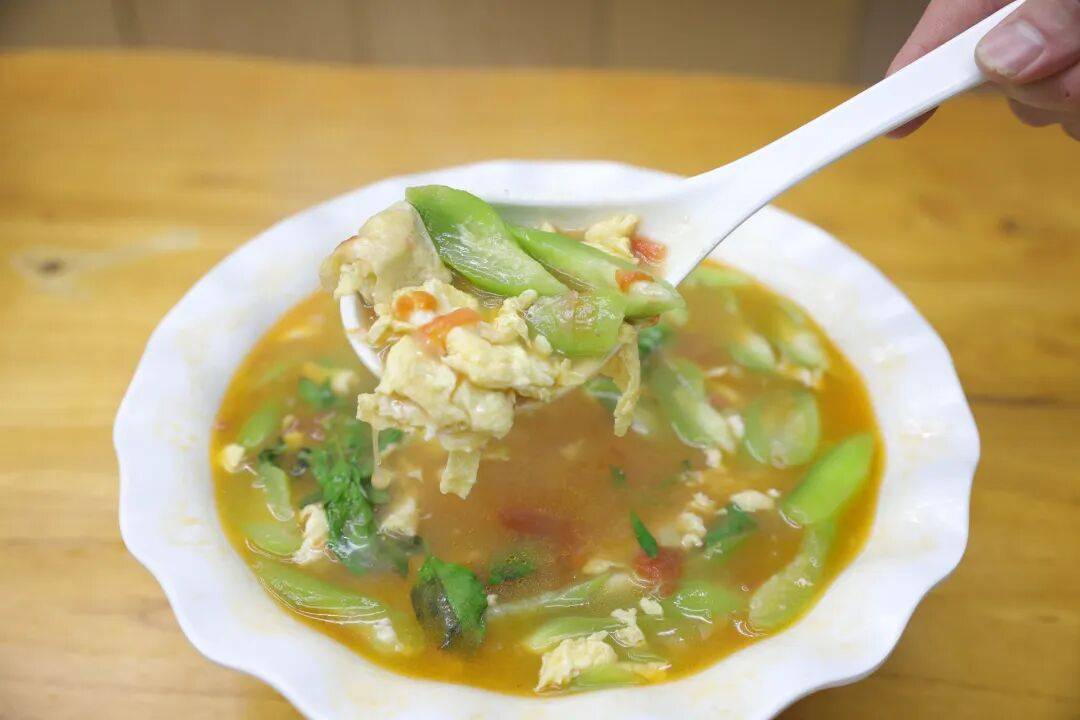 4、最后放入丝瓜,大约煮个一两分钟,丝瓜煮至七八成熟的时候,倒入适量的面糊搅拌均匀,把汤汁收浓,最后淋上芝麻香油,美味即成。