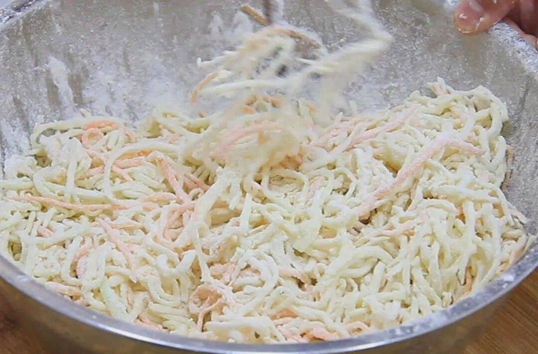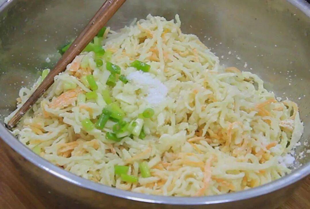 1、白萝卜、胡萝卜刮去外皮,切成宽细丝放在盆中。放入食盐2克,析出萝卜的水分, 把萝卜丝倒在笊篱上面压一压,再用细布擦干水分,加10克植物油,面粉50克,拌匀抖散。