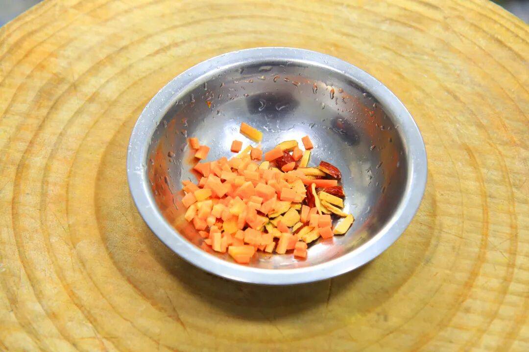 2、一把小米,放入清水中抓洗干净泡10分钟,更容易煮熟。再切一点红枣粒,胡萝卜丁配色,增加营养。