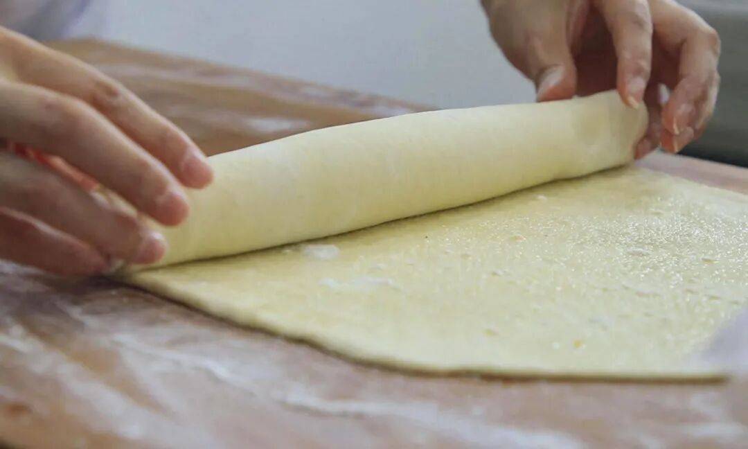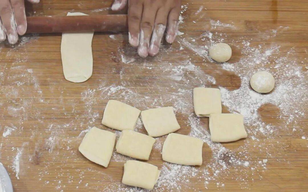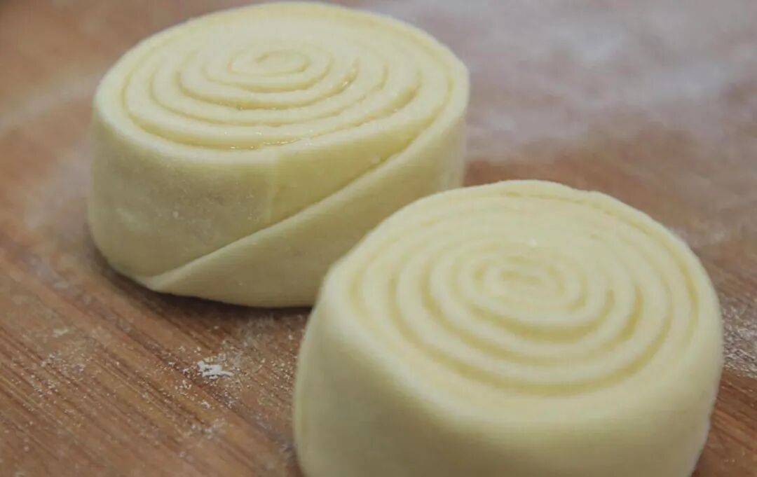 2、案板上撒面粉,把面团搓成长条,再揪成面剂子,摁扁,包入一小块油面,开口收紧,防止露馅。包好后撒上干面粉。