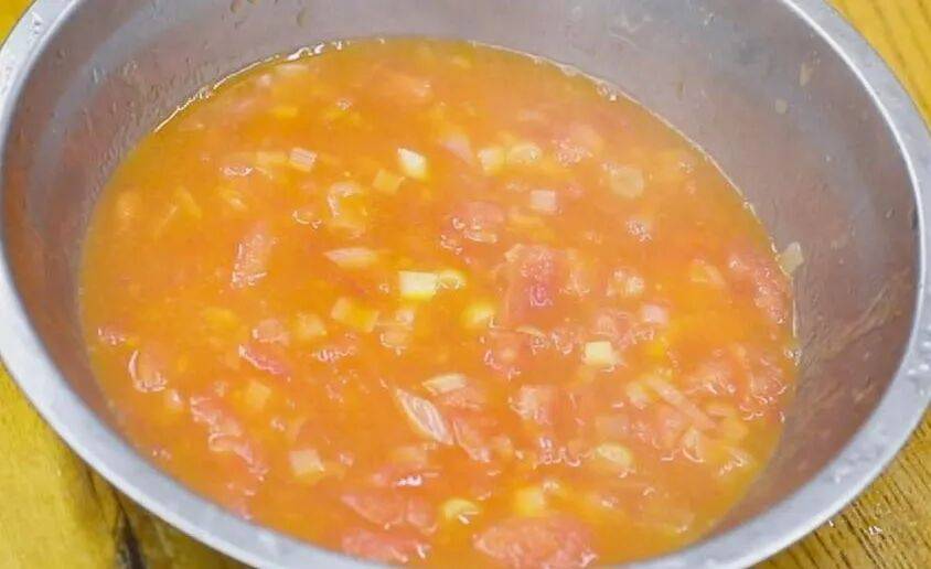 2、锅内烧油,放入葱花爆香,倒入番茄碎炒出红汁,加入适量的清水,小火熬三五分钟,把番茄汁熬浓,倒出来备用。