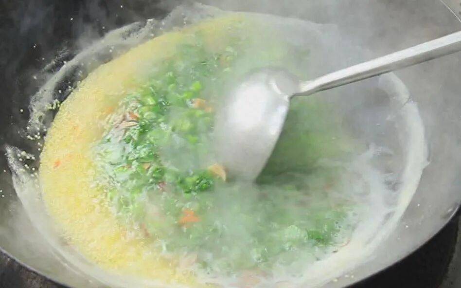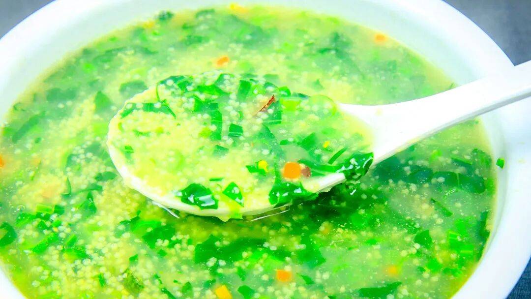 6、小米开花以后,把芥兰倒入锅中搅拌均匀。继续煮至小米羹微微烧开,勾入半勺芡粉,用勺子搅匀,再次煮开以后即可装盘上桌。