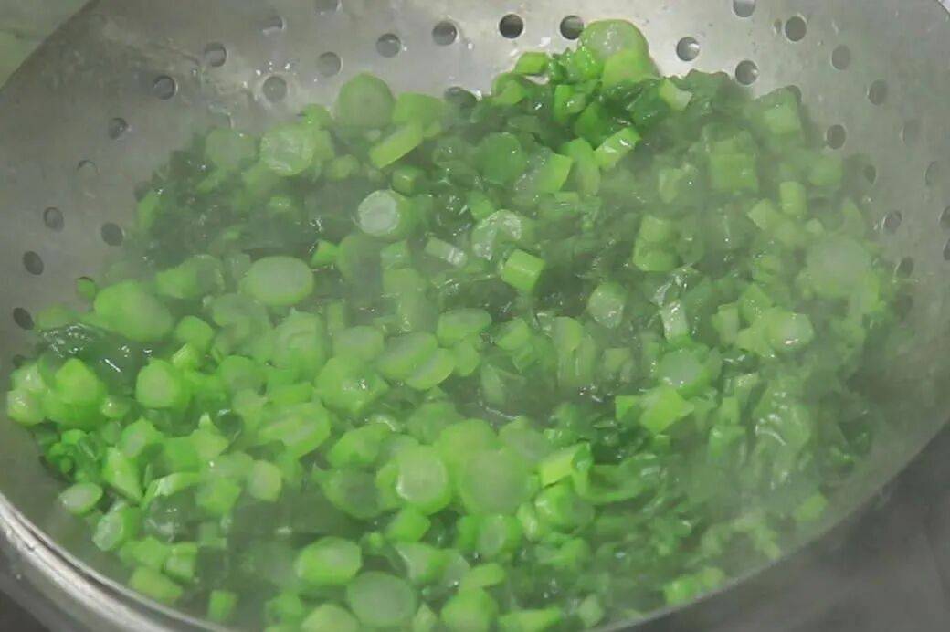 3、锅内加少许植物油和食盐,水烧开,芥兰下锅中焯水20秒钟去苦涩味。捞出凉水冲洗。