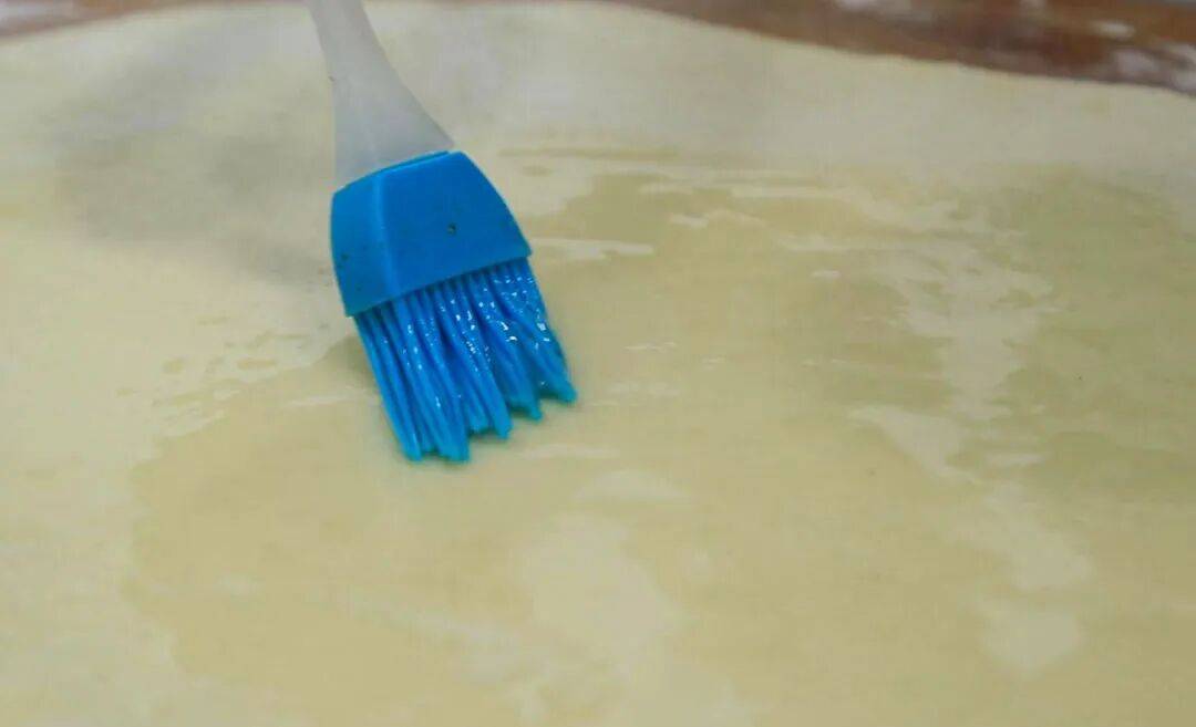 3、面饼上均匀刷上植物油,撒上面粉,方便分层。再撒一点食盐入底味,把面饼卷起来,卷成长条。用刀切成3厘米厚的饼坯。