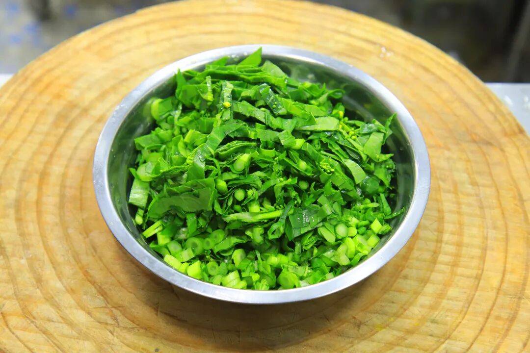 1、准备鲜嫩的芥兰一小把,切成碎末,也可以根据自己的口味换成其他时令蔬菜。