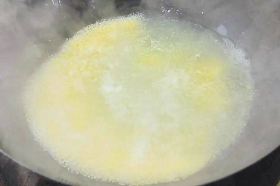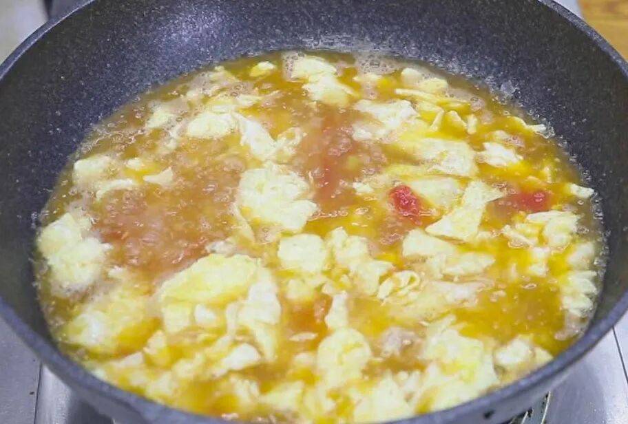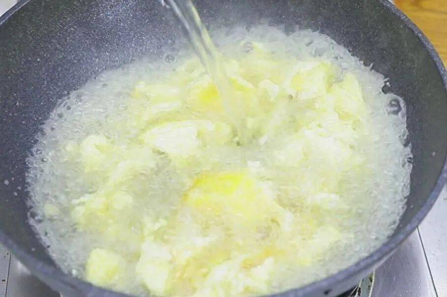 3、锅内再烧油,倒入半碗鸡蛋液煎一下,煎老一点煮出来更香。鸡蛋液全部凝固以后用锅铲炒碎,倒入适量的开水。
