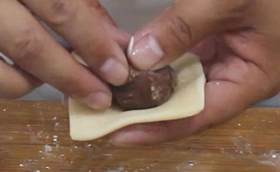 4、准备豆沙馅20克,掺入少许面粉,豆沙馅硬一些方便操作。然后把小面块擀成正方形的面片,包入豆沙,开口收紧。