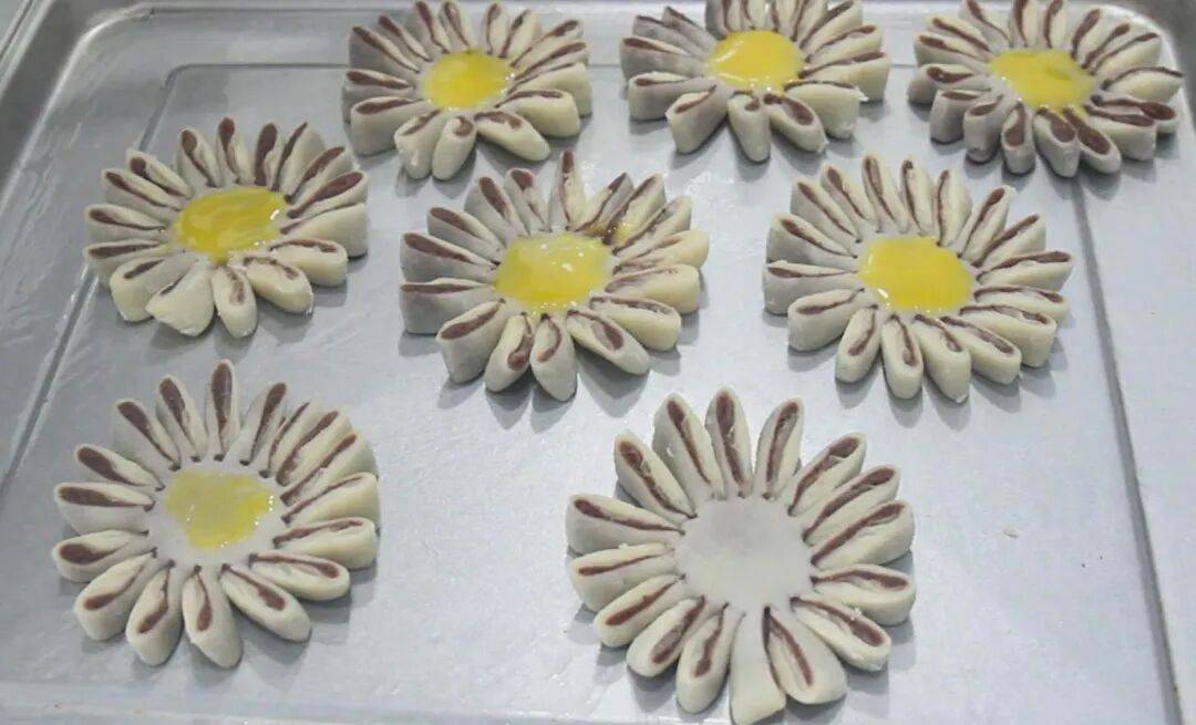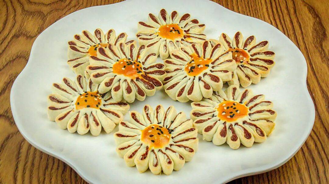 7、烤箱调到160度,开双层火,先预热3分钟,把菊花酥放入烤箱中烤25分钟,取出摆放在盘中即可食用。