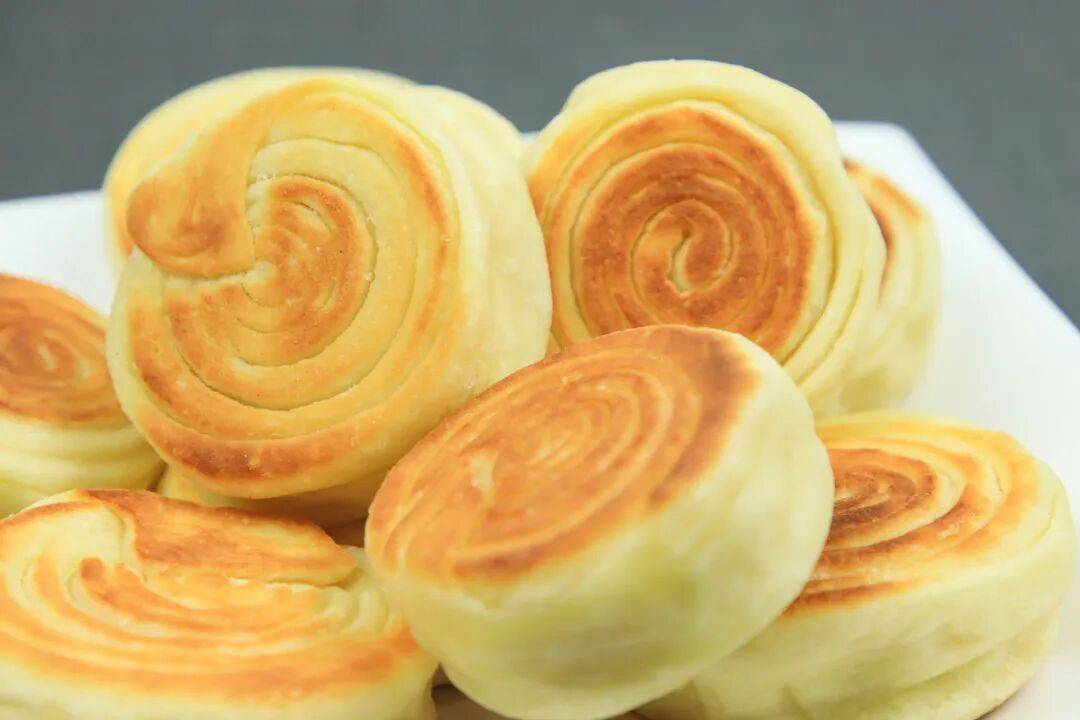 5、起锅开小火,刷上植物油,油温五成热,把饼坯放入锅中,来回翻几次,烙制6分钟左右,饼两面都呈金黄色,摁压快速回弹时就熟了。