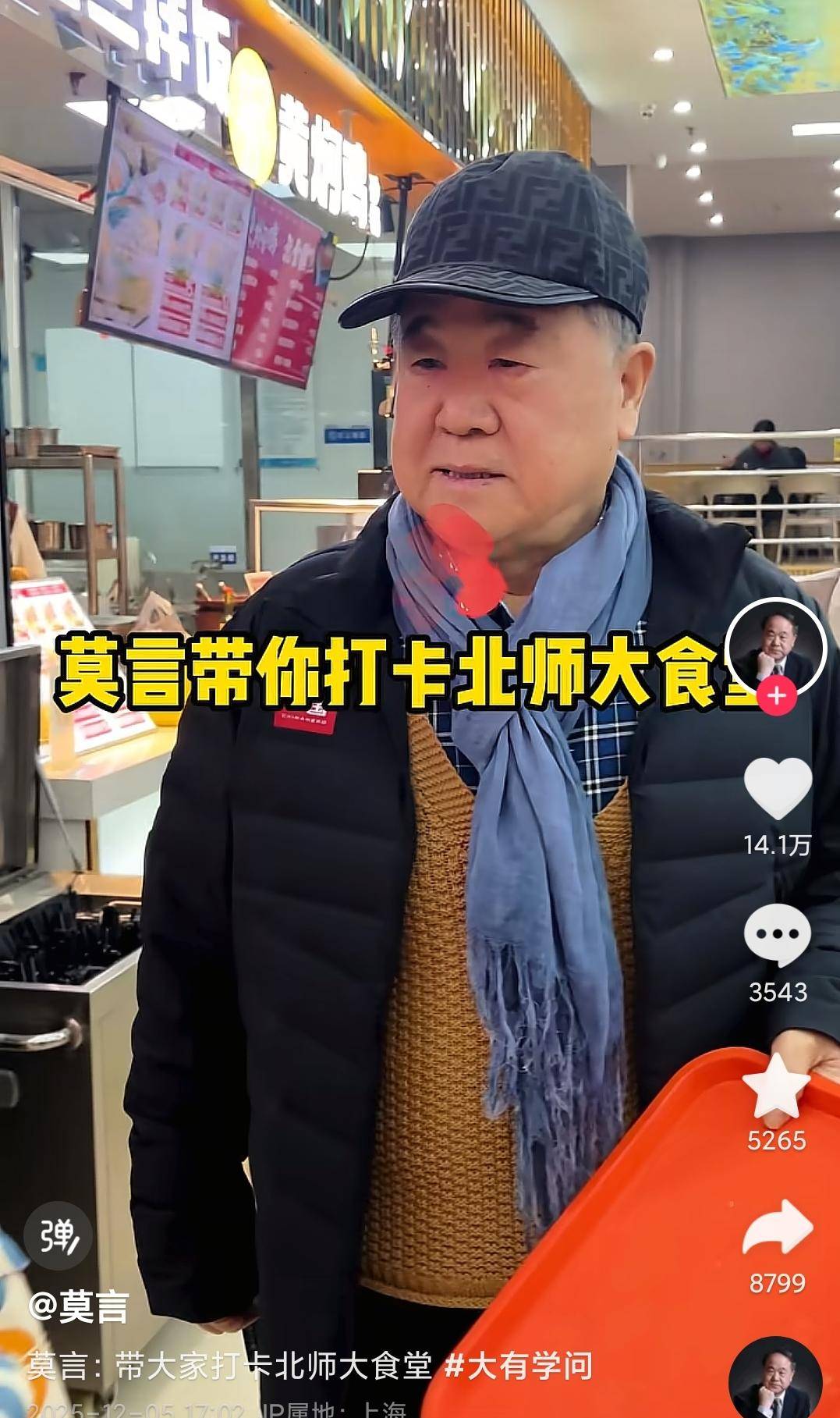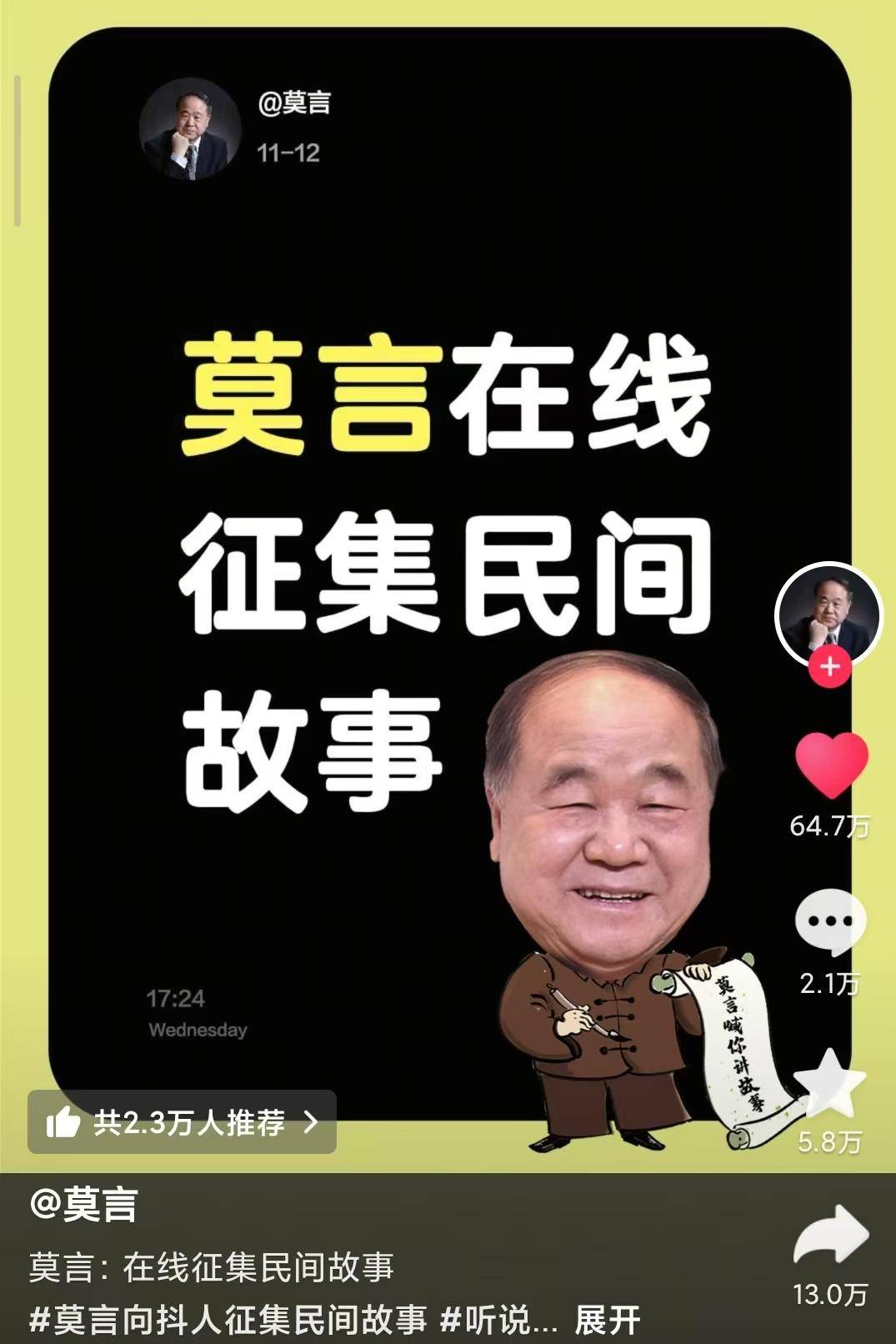 在短视频平台上,莫言已发布143条作品,粉丝量超过300万。最新一条视频中,他身穿羽绒服,揣着手并系着围巾,以vlog形式带网友“打卡”北京师范大学食堂,获赞超14万。此外,他还曾以Q版形象向网友征集民间故事,单条视频点赞近65万,评论逾2万条。面对网友分享的“湘西赶尸”故事,他饶有兴致地追问“说来听听”;读过网友分享的“笑面石”故事后,他用自己的表情包回复“哈哈哈哈”。