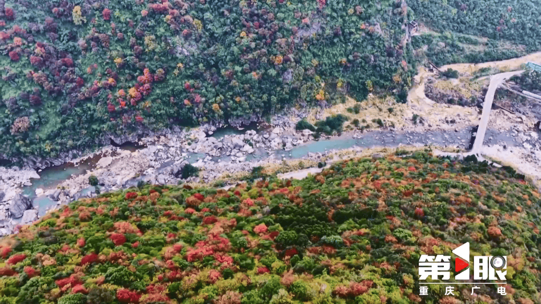 近日,龙河丰都段马良大桥周边,龙河峡谷彩林已迎来最佳观赏时节。