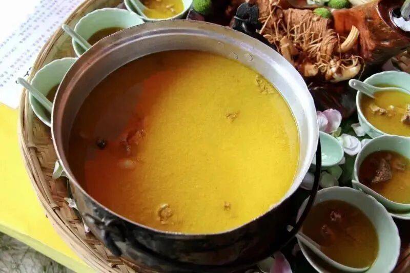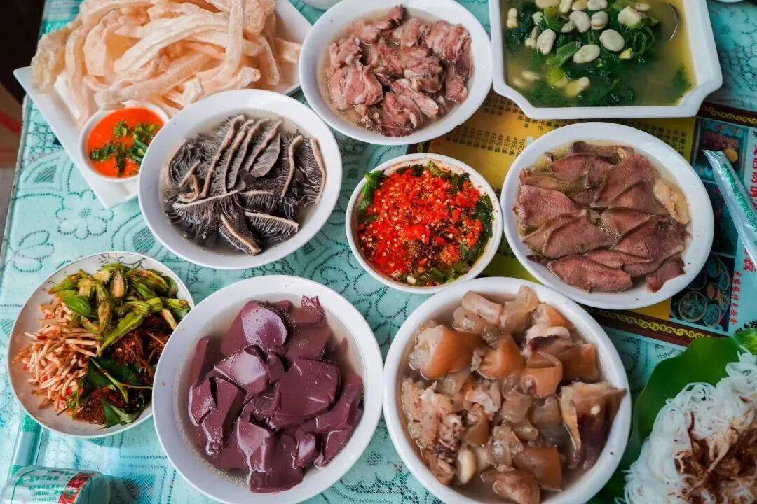 首屈一指的当属戛洒汤锅,作为花腰傣非遗美食,它以牛骨熬汤8小时以上,汤底浓郁醇厚,宛如山间清泉浓缩的精华。搭配牛肚、牛筋、牛心管等10余种新鲜牛杂,丰富口感在舌尖碰撞。蘸水更是点睛之笔,小米辣的热烈、香柳的清新、酸角汁的酸爽完美融合,酸辣开胃,每一口都能驱散旅途的疲惫。在戛洒镇的牛汤锅,大口吃肉、大碗喝汤,感受花腰傣人的热情豪爽。