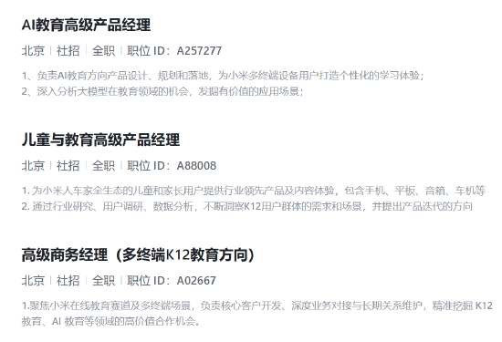快科技12月10日消息,近日,招聘网站页面显示,小米集团招聘页面上出现了多个与AI教育相关的岗位,涵盖高级商务、儿童与教育高级产品经理、教研产品经理等岗位。