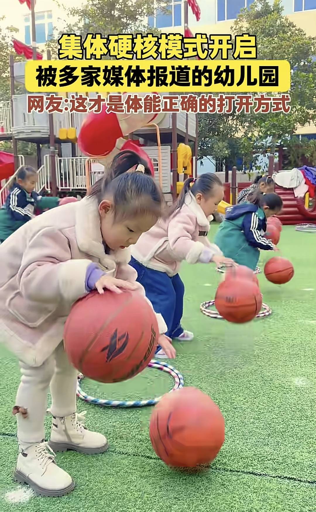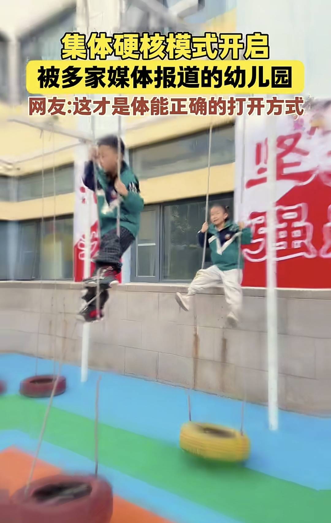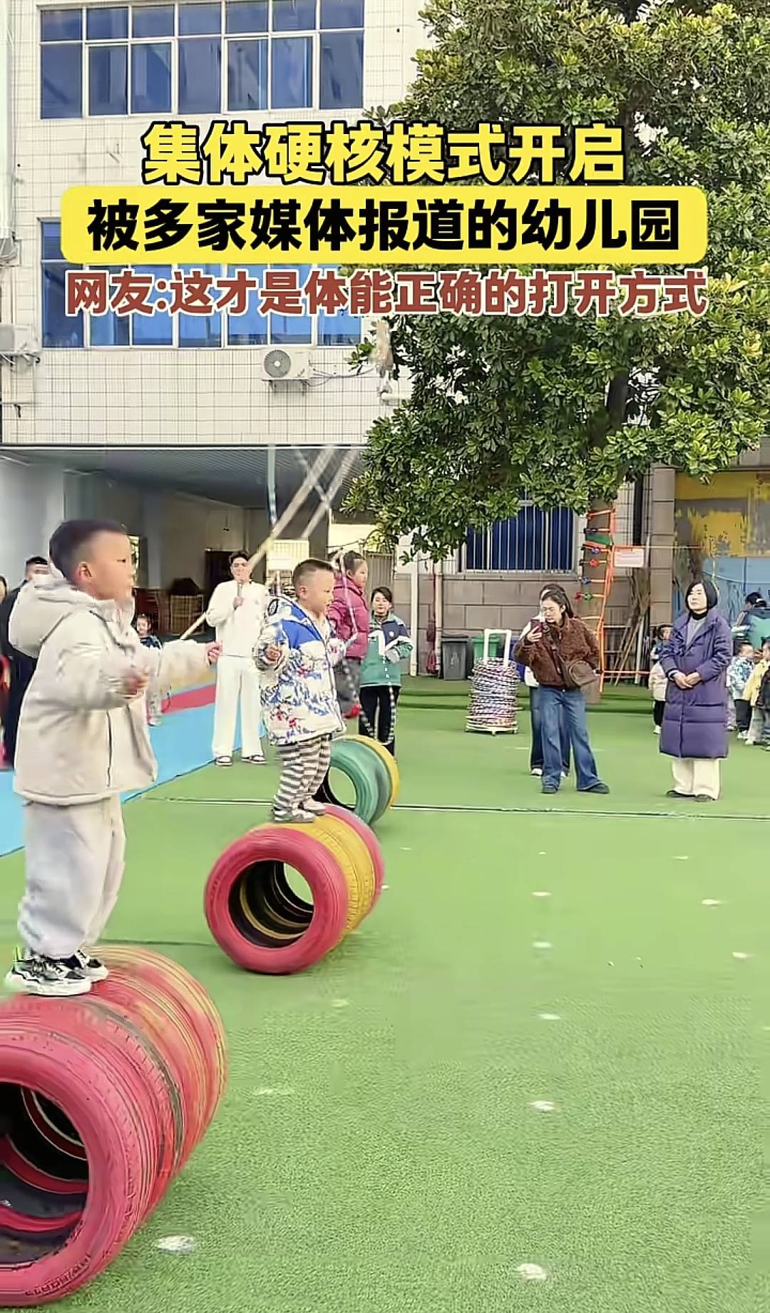 在视频中就看见这些孩子的户外活动不是简简单单的散个步或者是滑个滑梯,而是像那些练杂技的一样,站在滚筒上面转呼啦圈,攀爬等等,有点像军事训练类型的。小小年纪的孩子做起这些运动来真是有模有样。
