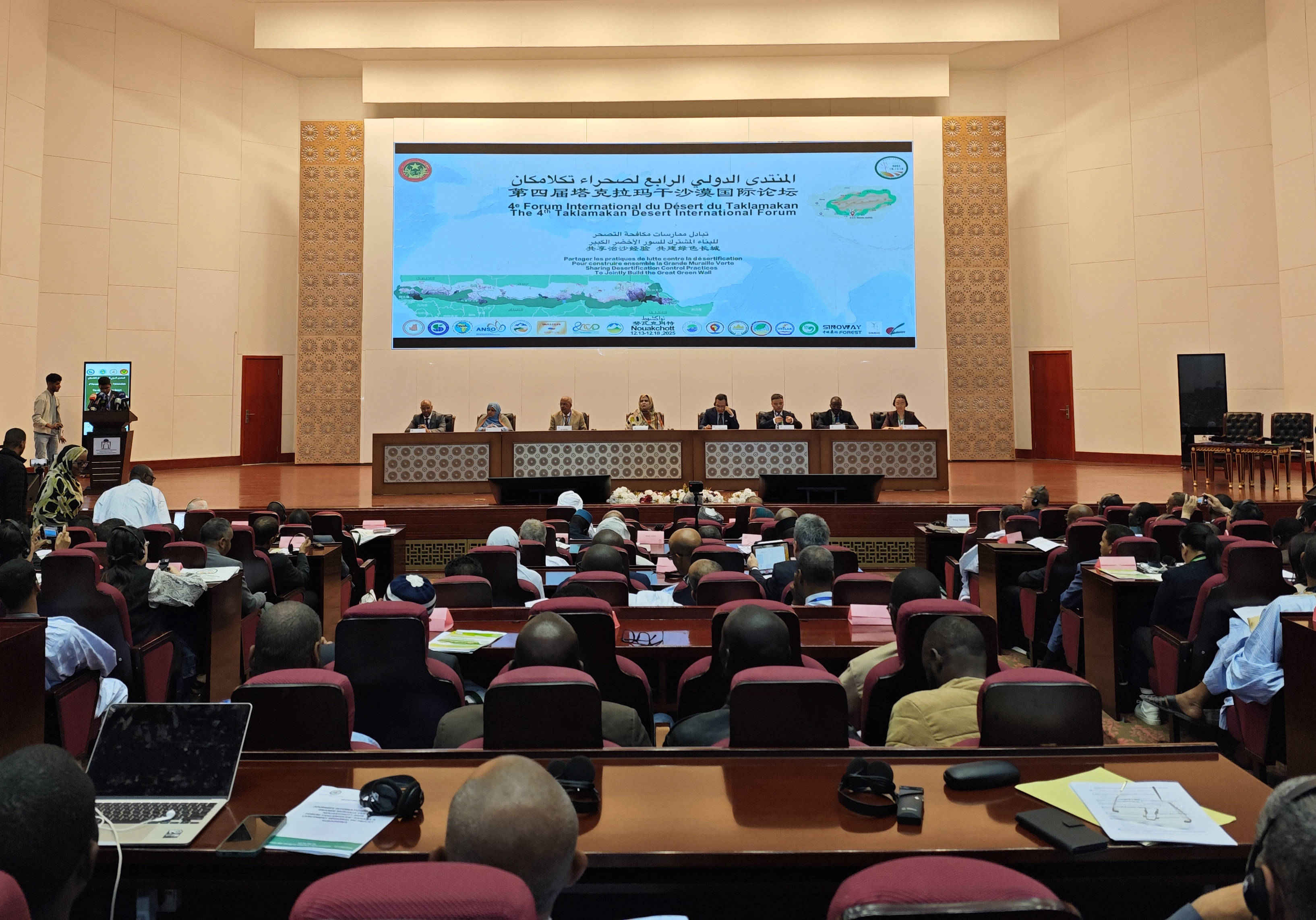 新华社照片,努瓦克肖特,2025年12月15日 这是12月14日在毛里塔尼亚首都努瓦克肖特拍摄的第四届塔克拉玛干沙漠国际论坛开幕式现场。 第四届塔克拉玛干沙漠国际论坛14日在毛里塔尼亚首都努瓦克肖特举行。与会的中国和非洲国家官员和专家表示,荒漠化和土地退化是人类面临的共同挑战,应加强科技交流与务实合作,推动治沙经验互鉴,共同推进非洲“绿色长城”建设。 新华社发(中国科学院新疆生态与地理研究所供图)