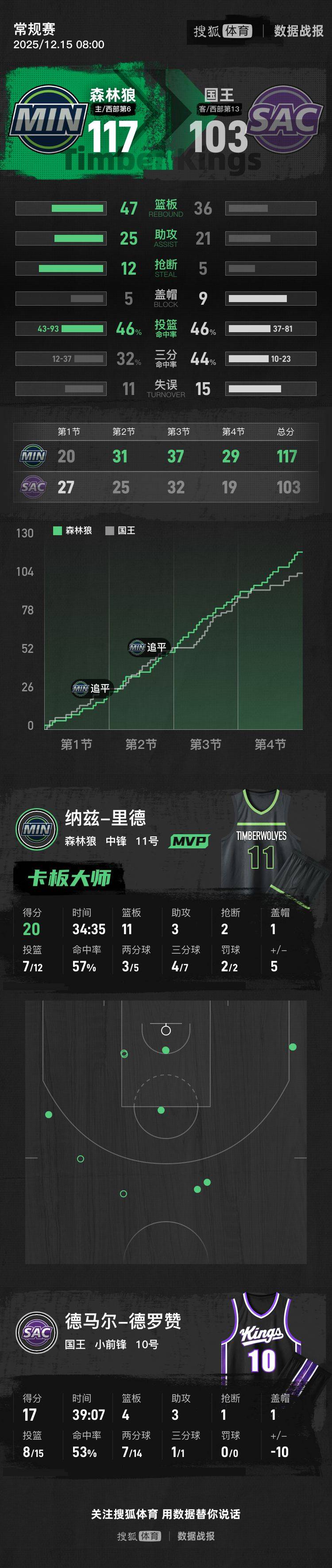 【搜狐体育战报】北京时间12月15日NBA常规赛,主场作战的森林狼以117-103击败国王,国王遭遇3连败。里德20分11篮板3助攻,德罗赞17分4篮板3助攻。