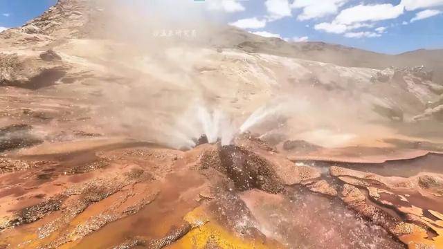 走到近前,一大片蒸腾的水面突然出现在眼前。上百个泉眼散落在台地上,泉水或静或沸,有些喷射到四五米高。空气被蒸汽托得微微发白,像是站在地球脉动的中央。有粉丝留言评论:“这是徒步探险级别,温泉倒是其次。”