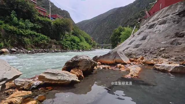 △左边河流,右边泡池,研究员夸这里“亲水氛围不错”。(图/@温泉研究员)