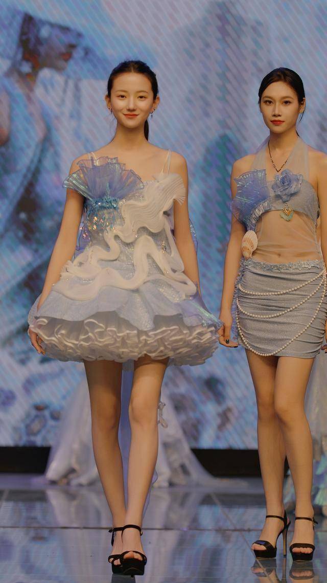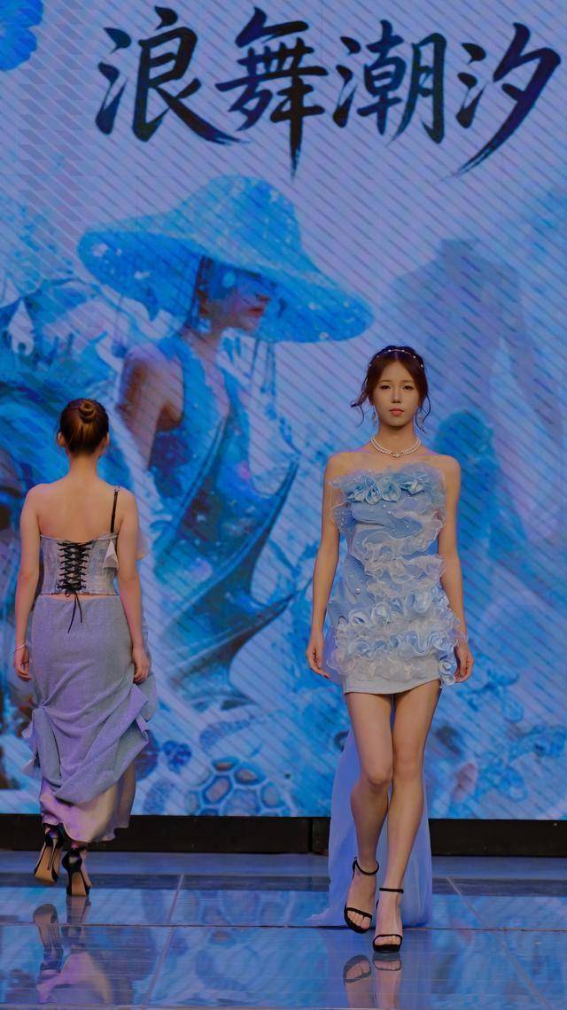 本次展演以“元启·融合”为主题,以创新为针、匠心为线,在织物与数据、过去与未来之间展开一场跨维度探索,重新思考服装作为连接自我与世界的媒介。展演共呈现《解构查尔瓦》《浪舞潮汐,听海》《墨韵革华,袂映新章》《皮影》《金叙》等十余个设计系列。作品围绕非遗传承、可持续时尚、国潮创新、数字融合、海洋保护等多元议题展开。