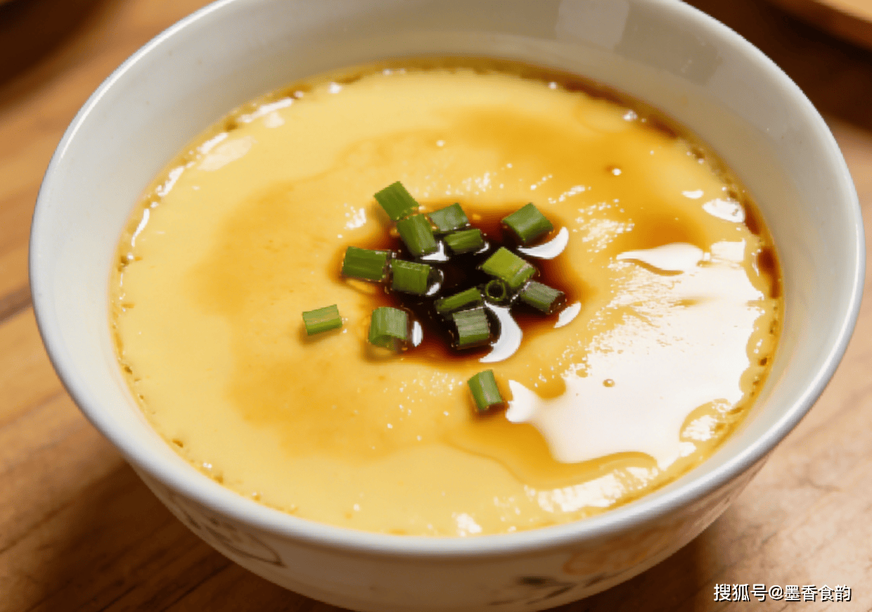 这道菜的精髓在于"耐心",但操作起来其实最快。两个鸡蛋打散,加入1.5倍的温水(这是经过计算的黄金比例)。蛋液最好过一遍筛,滤掉气泡和杂质,这样蒸出来表面像镜子一样光滑。盖上盘子(防止水蒸气滴落),水开后上锅蒸8分钟。关火后焖一会儿再拿出来,淋上酱油和香油。用勺子背接着酱油,让它沿着边缘缓缓流下,画面极度舒适。用牙签戳一下,没有蛋液渗出,就是完美的布丁质感。