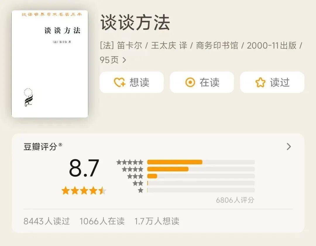 “看完第一感觉是非常惭愧,笛卡尔的自律和好学让他在如此的时代局限下都能发挥自己最大限度的才智,这样才算是活过吧。”