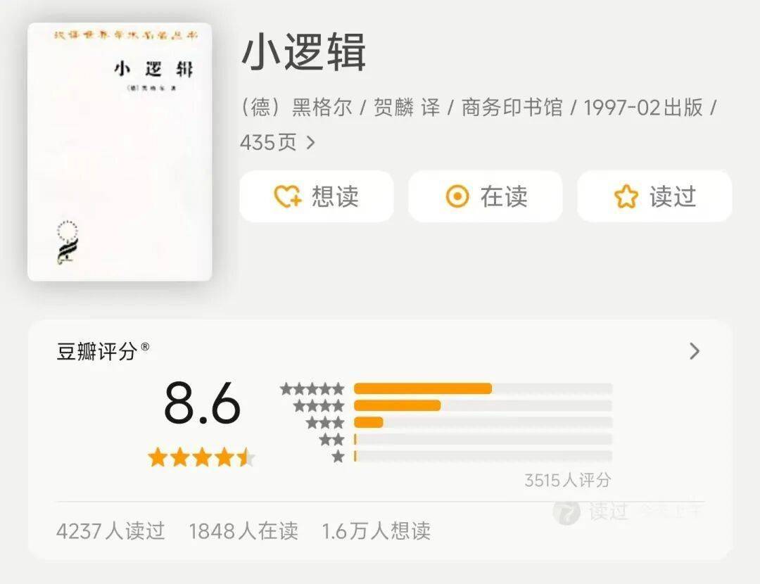 老人说“脑子不用会生锈”,所以,阅读不能只找安逸的枕边书,也要读磨脑子的书。磨脑子的书当然首选黑格尔《小逻辑》。