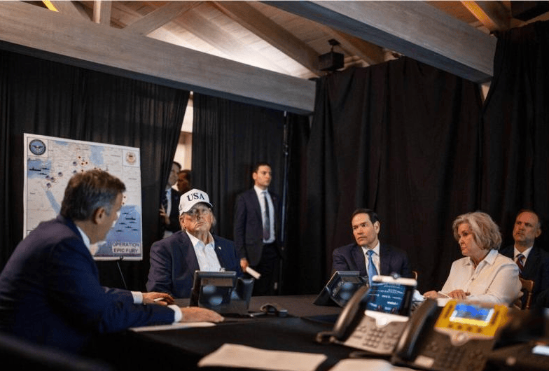 白宫2月28日发布的照片显示,美国总统特朗普(左二)、国务卿鲁比奥(右三)和白宫办公厅主任怀尔斯(右二)在“监控”对伊朗的袭击行动。(法新社)