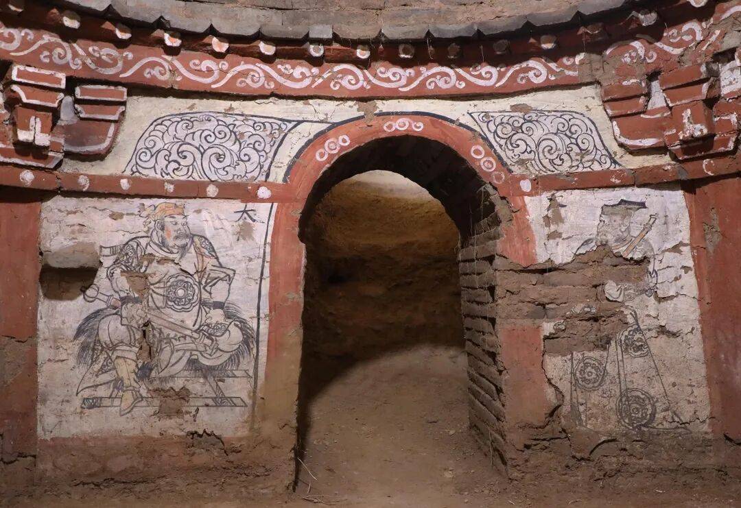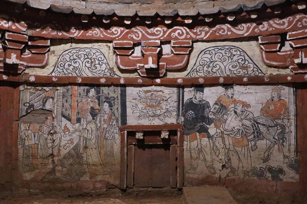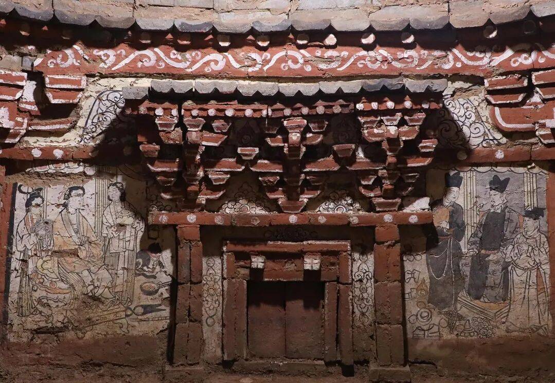 墓室内采用砖雕与壁画相结合的装饰方法。砖雕主要用于表现墓室内的倚柱、铺作、檐枋和仿木构假门等,其上兼施木作彩绘,拱眼壁饰卷草纹。壁画主要绘在拱眼壁、假门上方和四壁等位置。仿木构砖雕部分不施或施很薄的地仗层,上涂红彩;墓壁施很薄的地仗层,地仗层上白灰打底。壁画多以黑彩描边,以红、橙、黑、灰、黄等填充。