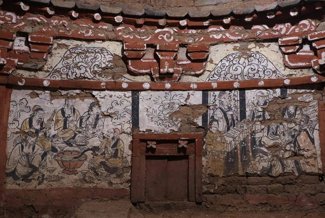 假门两侧绘制壁画:南侧绘5名男性,围坐一高足葵口大碗前,奏拍板、吹笛、吹箫、吹笙、闲坐。葵口大碗内有食物及勺子,每人身前有一盏,一碟。两侧绘云气。五人服装形制相似,皆为长袍,脚着黑色鞋子。除中间吹箫者戴冠,其余人皆包头巾。人物服饰多为黄色,仅在衣领袖口有黑边。
