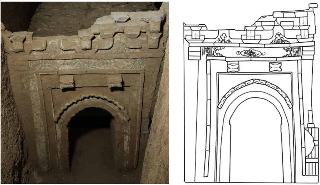 墓门 砖雕仿木构门楼,两侧砌倚柱,柱上砌阑额。倚柱和阑额内砌上额、槫柱、门额、立颊,门额上砖雕2枚四瓣蒂形门簪。圆券门,上有砖雕仿瓦门檐。倚柱柱头砌普拍枋,枋上砖砌柱头铺作2朵、补间铺作1朵,部分铺作及其以上结构被破坏,铺作之间砌拱眼壁。仿木构砖雕部分不施或施很薄的地仗层,地仗层上涂红、橙、绿、黑、白彩等进行装饰,题材以花卉为主。