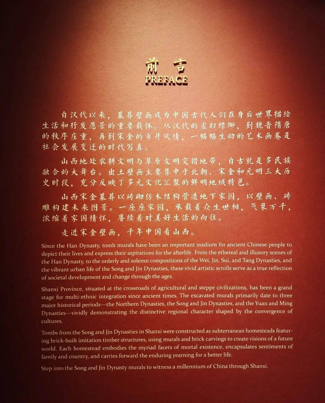 自汉代以来,墓葬壁画成为中国古代人们在身后世界描绘生活和抒发愿景的重要载体。从汉代的虚幻缥缈,到魏晋隋唐的秩序庄重,再到宋金的市井风情,一幅幅生动的艺术画卷是社会发展变迁的时代写真。山西地处农耕文明与草原文明交错地带,自古就是多民族融合的大舞台。出土壁画主要集中于北朝、宋金和元明三大历史时段,充分反映了多元文化汇聚的鲜明地域特色。 本次展览通过71件/组展品,以山西宋金墓葬出土的壁画为依托,呈现墓主生活场景与对美好生活的愿景,同时传递古人的家国情怀,带领观众感受“千年中国看山西”的深厚底蕴,以及传统艺术的魅力与文化传承。