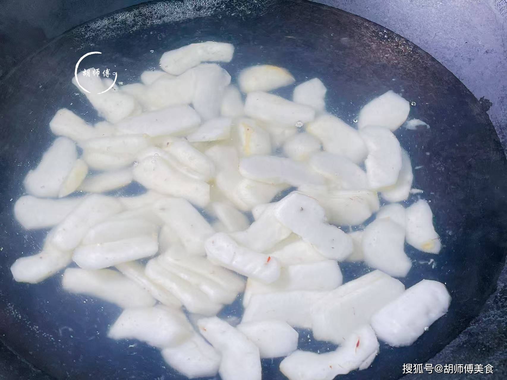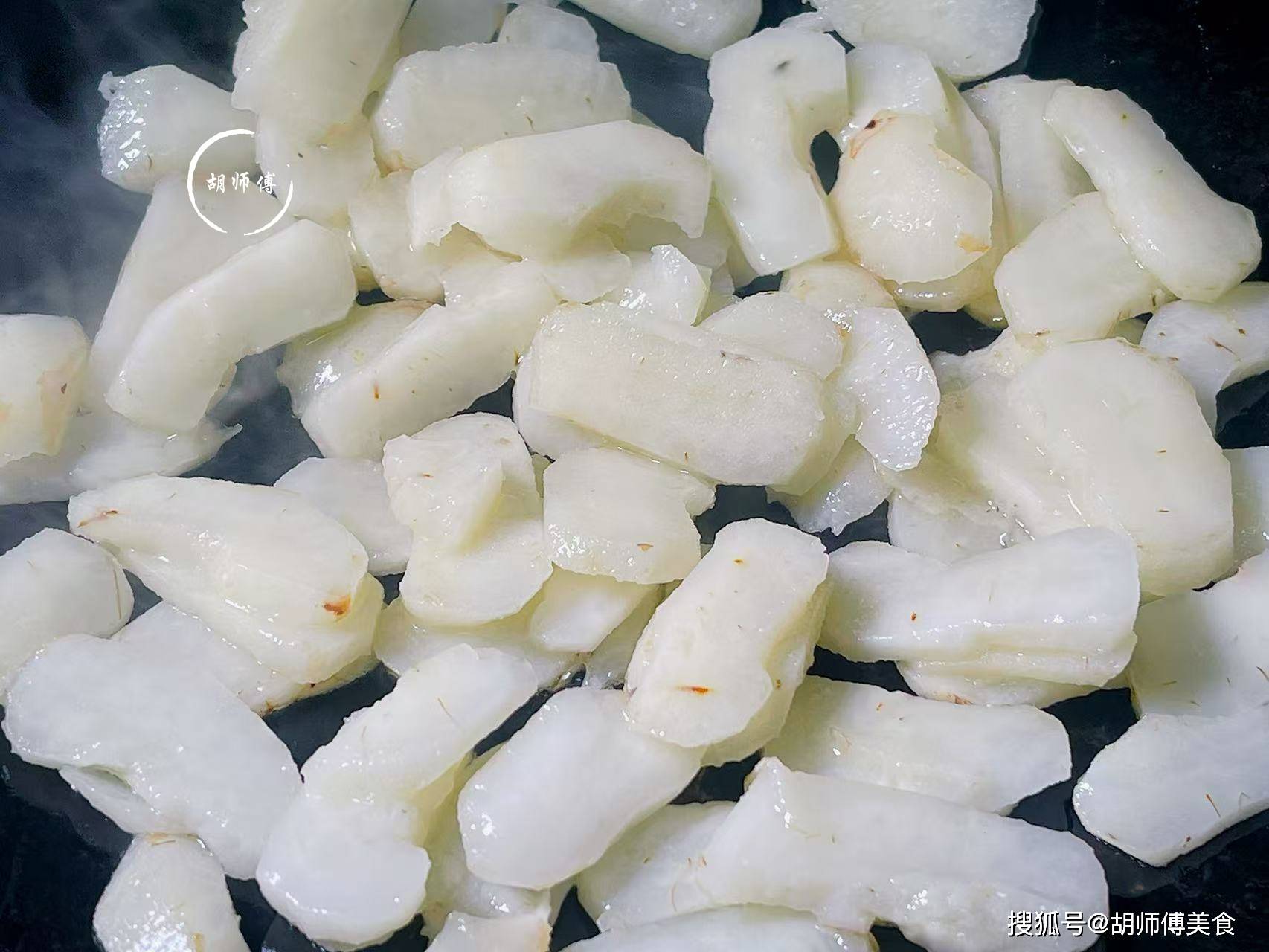 第四步:把锅烧热后,放入一勺油到锅中,等油温烧到5成热后,将马蹄放入锅中,大火翻炒半分钟,一直要翻动,防止马蹄粘锅变糊。
