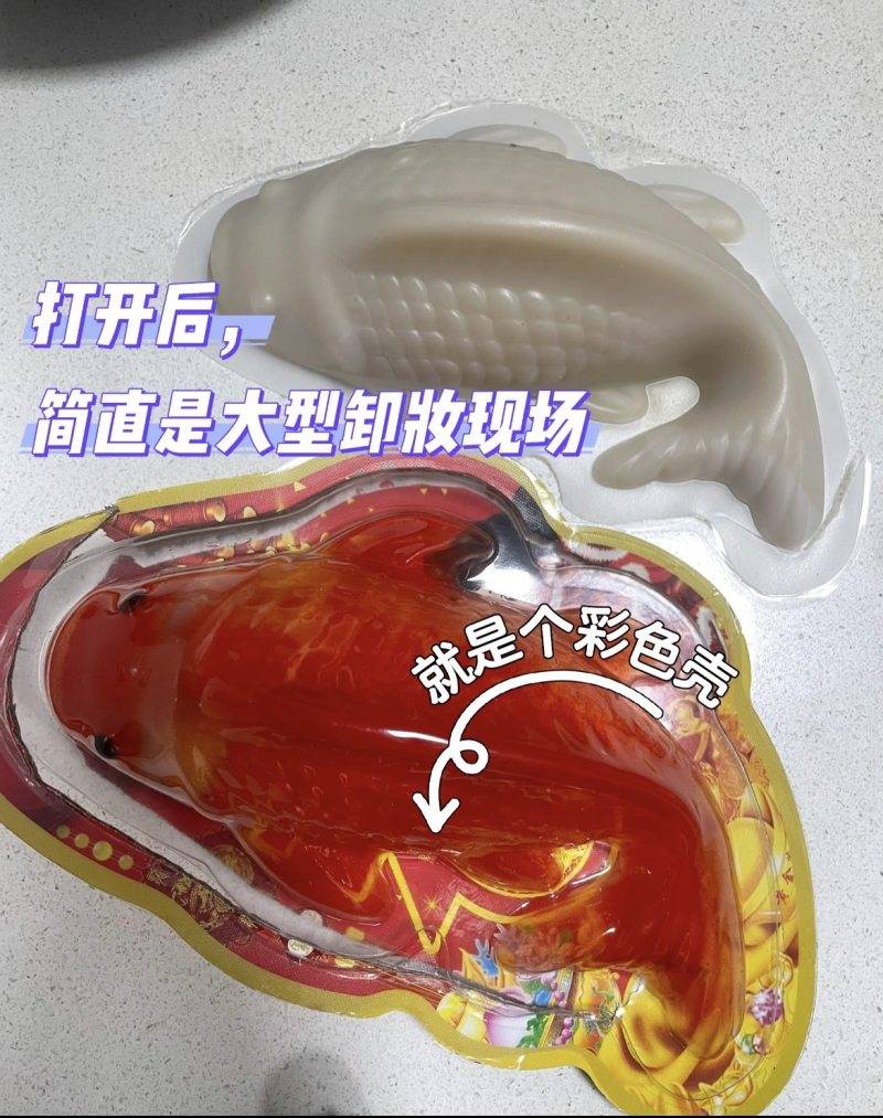 红色锦鲤,白色真身,用不可食用外壳充当“美颜滤镜”的现象在年糕鱼产品中更为普遍。