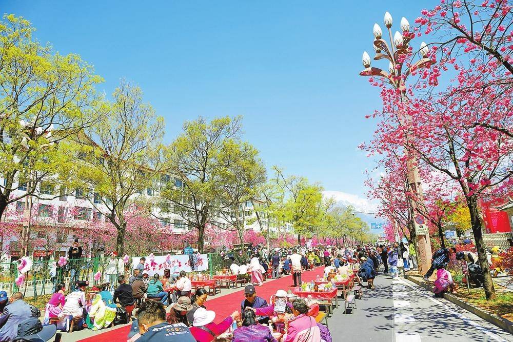 雪山路樱花大道上的纳西特色“千人长街宴”。 记者 李铁成 摄