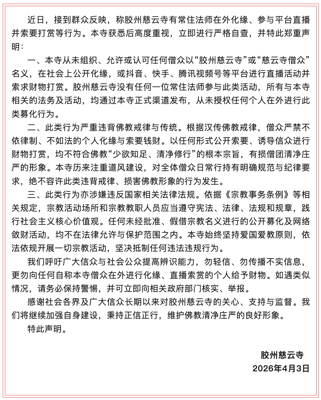 胶州慈云寺在公开声明中表示,本寺从未组织、允许或认可任何僧众以“胶州慈云寺”或“慈云寺僧众”名义,在社会上公开化缘,或抖音、快手、腾讯视频号等平台进行直播活动并索求财物打赏。胶州慈云寺没有任何一位常住法师参与此类活动,所有与本寺相关的法务及活动,均通过本寺正式渠道发布,从未授权任何个人在外进行此类募化行为。