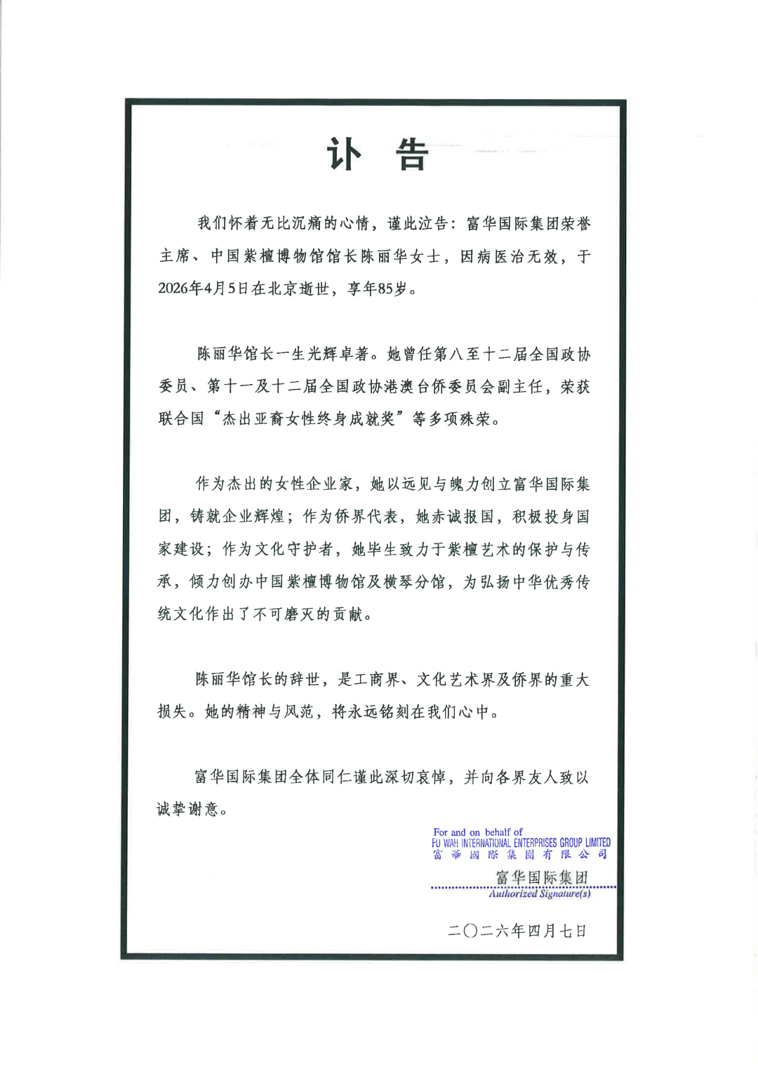 4月7日,富华国际集团发布讣告:富华国际集团荣誉主席、中国紫檀博物馆馆长陈丽华女士,因病医治无效,于2026年4月5日在北京逝世,享年85岁。