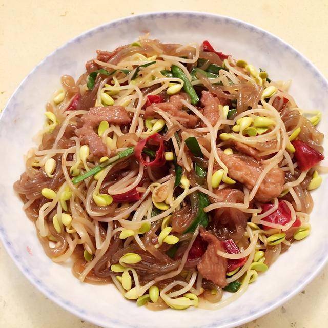 5.下处理好的豆芽,调入盐3克,中火翻炒至豆芽断生;