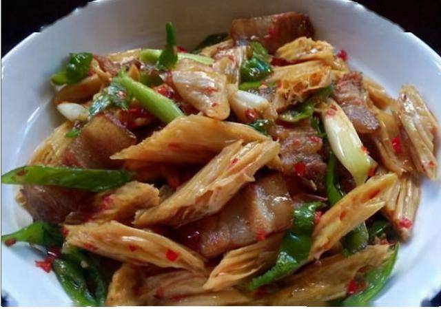 3、油锅烧热,下入肉片翻炒,炒至肉片变色加入红辣椒碎、腐竹炒约2分钟;