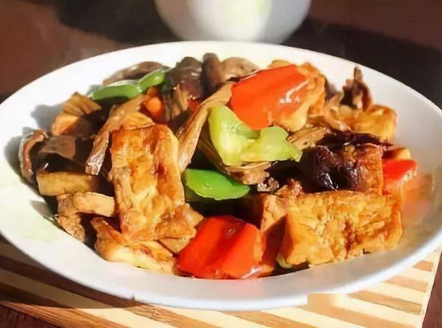 材料:豆腐200克、茶树菇300克、蚝油、盐、姜、青椒1个、胡萝卜1根