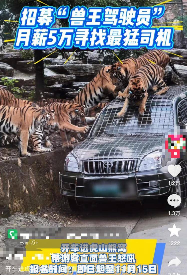 大皖新闻记者注意到,10月22日晚,该动物园在社交平台发布了一则招聘视频,称以“月薪5万”招募“兽王驾驶员”,负责驾驶车辆进入虎山、熊窝等猛兽散放区,“带游客直面兽王怒吼”。